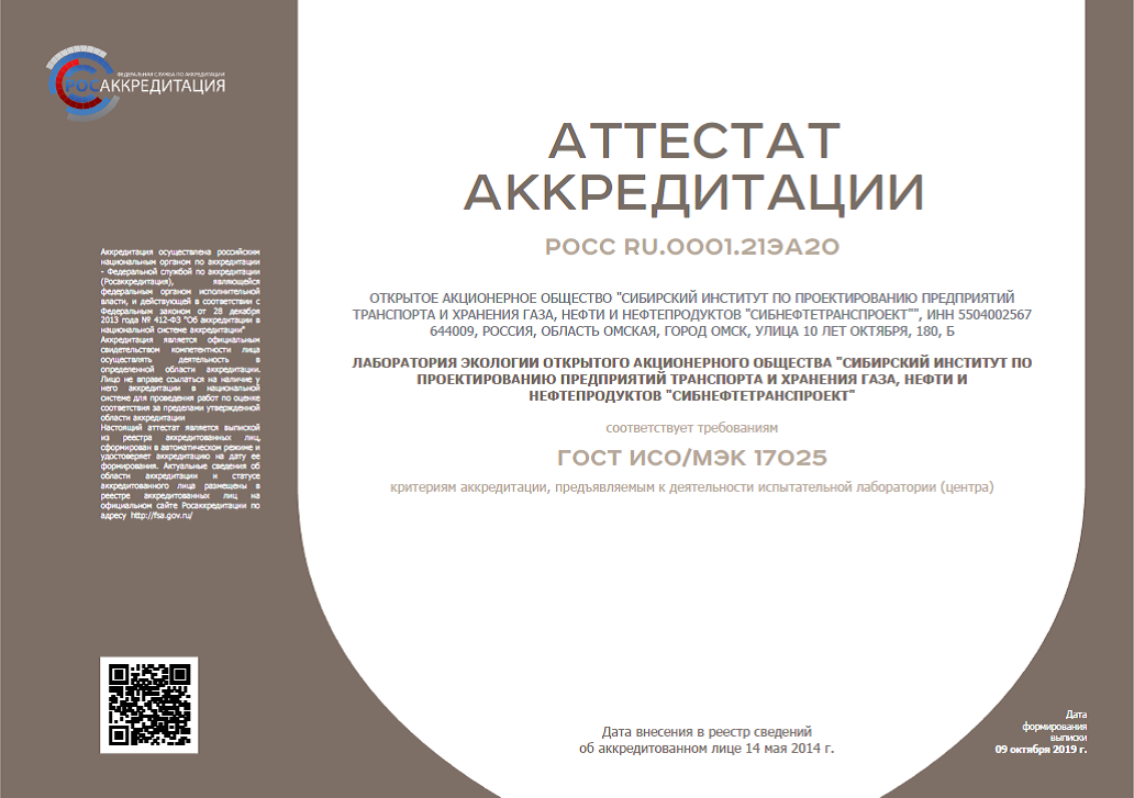 Лаборатория экологии аккредитована Федеральной службой по аккредитации Аттестат аккредитации № РОСС RU.0001.21ЭА20 для проведения работ по испытаниям компонентов объектов окружающей среды в соответствии с областью аккредитации. |